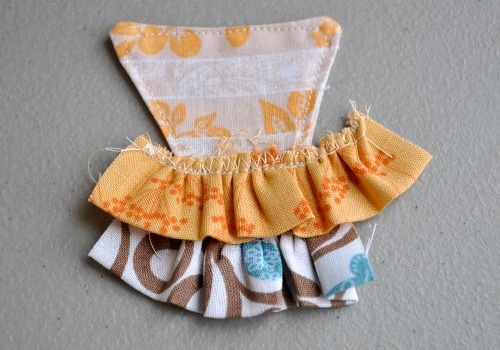 Cắt 2 dải vải màu trắng có chiều dài gấp 3 lần chiều dài của cạnh đáy tam giác, rộng 3cm. Gấp đôi dải vải theo chiều rộng, sau đó gấp 2 mép theo chiều dài vào trong 0,5cm, dùng bàn là là thẳng rồi đặt lên trên cạnh đáy tam giác để che phần đường may ở bước 8 và may đường chần mép. Tương tự bạn may cho tam giác còn lại.