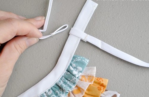 Cắt 3 dải vải trắng dài gấp đôi chiều dài cạnh lớn của tam giác, rộng 2cm. Gấp nếp tương tự như dải vải ở bước 9 và dùng bàn là là thẳng. Sau đó bạn gấp một đầu để luồn dải vải đã may ở bước 9 vào trong và khâu cố định. May dải vải tương tự cho bên còn lại.
