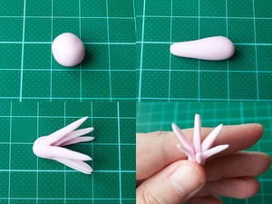 Vo đất sét Nhật màu thành viên bi tròn có đường kính 1cm, tiếp tục vê viên bi thành hình giọt nước dài 2cm, dùng mũi kéo cắt đoạn dài 1,5cm thành 6 cánh hoa. Tiếp theo dùng ngón tay cái và ngón tay trỏ vê tròn bên dưới 6 cánh hoa.