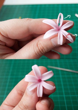 Tạo độ cong cho cánh hoa bằng cách lấy chiếc que tròn dài, đặt cánh hoa lên trên đầu ngón tay, ấn nhẹ đầu que dọc theo chiều dài trên cánh hoa tạo độ lõm giữa cánh hoa làm cánh hoa dài và cong. Dùng chiếc que đâm xuyên vào giữa bông hoa tạo thành lỗ tròn để đặt nhụy hoa vào bên trong.