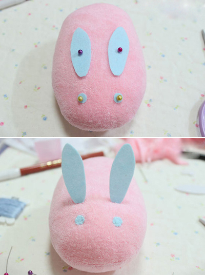 - Đặt đôi mắt và đôi tai lên thân thỏ, dùng kim ghim giữ cố định lại, sau đó khâu cố định đôi mắt và hai đầu đôi tai thỏ.