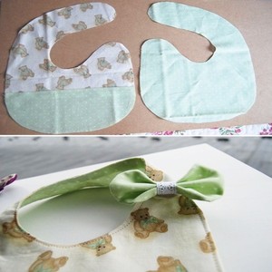Cắt 2 miếng vải trơn cùng kích cỡ để làm yếm cho bé, lấy 1 miếng vải cắt rời theo đường kẻ ngang, giữ lại 1/4. Cắt 1 miếng vải hoa có kích thước trùng khít với 3/4 của yếm. Gấp mép đường thẳng của miếng vải hoa, đặt chồng khít lên miếng vải trơn và khâu ráp chúng lại trên mặt phải. Áp mặt trái của 2 miếng vải lên nhau, gấp viền xung quanh rồi khâu ráp chúng lại.