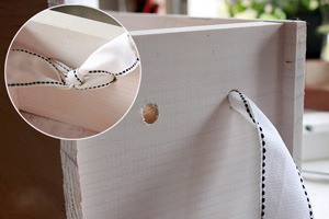 - Khoan 2 lỗ trên tấm vuông nhỏ ở hai đầu, sau đó luồn sợi dây ruy băng và buộc nơ.