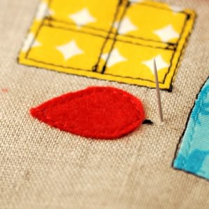 Đặt hai cửa vào "tường" nhà, ghim ổn định cân đối và may sát mép. Sau đường may sát mép phía trong, bạn may thêm đường may sát mép phía ngoài bằng chỉ màu tương phản để tạo nét cho cửa. Cửa sổ có thể may thêm đường chữ thập vờ như các ô kính, còn cửa vòm có thể thêm số nhà bằng cách thêu hoặc khâu áp vải.