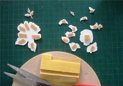 Dán xốp dán rải đều vào mặt sau của các miếng bìa hoa vừa cắt. Phần nhị hoa dán xốp dày hơn chút hoặc dán 2 lần xốp dán mỏng lên nhau cũng được.