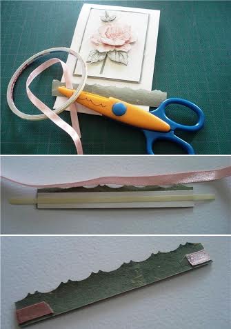 Dùng kéo cắt đường diềm để cắt hai dải bìa màu, dải trắng nhỏ hơn dán lên trên dải xanh. Thắt nơ một đoạn ruy-băng rồi dùng băng dính hai mặt dán chặt phía trên dải bìa trắng. Dán chồng hai dải bìa trang trí đó xuống phía lớp bìa thiệp có dán nền thiệp hình hoa.
