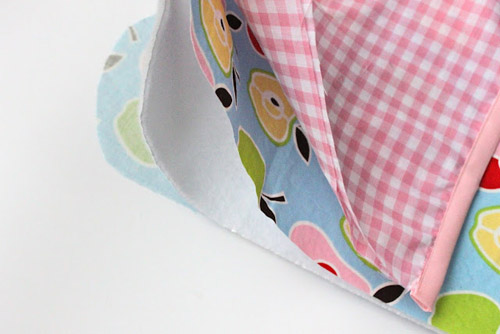 Bây giờ, đặt tấm vải bông lót giữa mặt trái của 2 tấm vải hoa văn rồi đặt phần găng tay ca rô đã bọc viền trên mặt phải của tấm vải hoa văn lên. Lưu ý khi chồng các lớp vải lên nhau bạn nhớ sắp xếp cho các mảnh vải khớp nhau.
